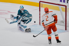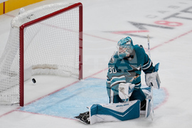 San Jose Sharks goaltender Yaroslav Askarov (30) is unable to stop a goal by Anaheim Ducks' Leo Carlsson in overtime of an NHL hockey game Saturday, Oct. 11, 2025, in San Jose, Calif. (AP Photo/Godofredo A. Vásquez)