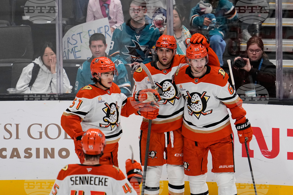 Anaheim Ducks left wing Chris Kreider, center, celebrates with teammates after scoring a goal against the San Jose Sharks during the third period of an NHL hockey game, Saturday, Oct. 11, 2025, in San Jose, Calif. (AP Photo/Godofredo A. Vásquez)