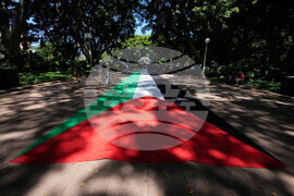 A giant Palestinian flag is laid out on the ground during a rally in Sydney, Australia, Sunday, Oct. 12, 2025, supporting Palestinians in Gaza. (AP Photo/Rick Rycroft)