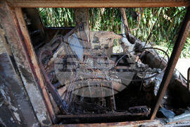 In this photo taken during a trip supervised by pro-military Myanmar media, a damaged fire engine is seen at the Fire Service Department building in Kyaukme, northern Shan State, Myanmar, Friday, Oct. 10, 2025. (AP Photo/Aung Shine Oo)