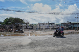 In this photo taken during a trip supervised by pro-military Myanmar media, locals ride motorbikes past a street in Kyaukme, northern Shan State, Myanmar, Friday, Oct.10, 2025. (AP Photo/Aung Shine Oo)
