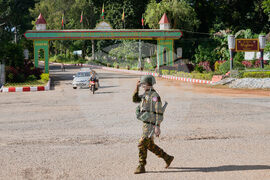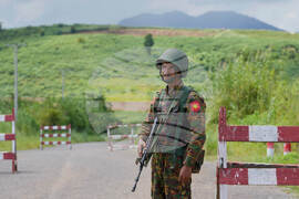In this photo taken during a trip supervised by pro-military Myanmar media, a soldier keeps guard at a check point in Kyaukme, northern Shan State, Myanmar, Friday, Oct. 10, 2025. (AP Photo/Aung Shine Oo)