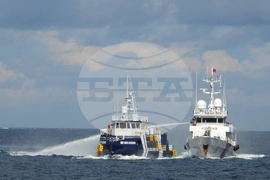In this photo provided by the Philippine Coast Guard, a Chinese Coast Guard vessel, right, fires it's water cannon at the Philippine's BRP Datu Pagbuaya near Philippine occupied Thitu island locally called Pag-asa island at the South China Sea on Sunday Oct. 12, 2025. (Philippine Coast Guard via AP)