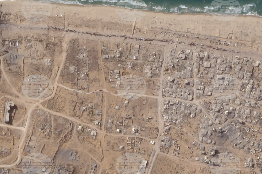 In this satellite photo from Planet Labs PBC, a line of vehicles can be seen waiting to travel north along the Al Rashid Street to Gaza City, Gaza Strip, Saturday, Oct. 11, 2025. (Planet Labs PBC via AP)