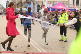 София (12 октомври 2025) София (12 октомври 2025) При дебюта си в тази дисциплина Ейбрахам Киплимо (вдясно) измина класическата дистанция от 42.195 км за 2:17.11 часа. Той бе награден за първо място, но фотофиниш отреди победата на Шедрак Кимайо. На снимката: директорът на Софийския маратон Анатоли Илиев, Абрахам Киплимо и кметът на София Васил Терзиев.