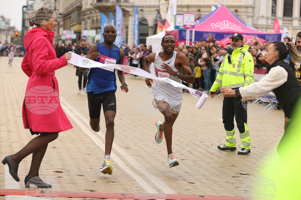 София (12 октомври 2025) При дебюта си в тази дисциплина Ейбрахам Киплимо (вдясно) измина класическата дистанция от 42.195 км за 2:17.11 часа. Той бе награден за първото място, но фотофиниш отреди победата на Шедрак Кимайо (вляво).