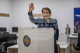 Perparim Rama, former mayor of capital, from the Lidhja Demokratike e Kosoves, LDK (Democratic League of Kosovo), waves before casting his ballot during the municipal elections in Pristina, Kosovo on Sunday, Oct. 12, 2025. (AP Photo/Visar Kryeziu)