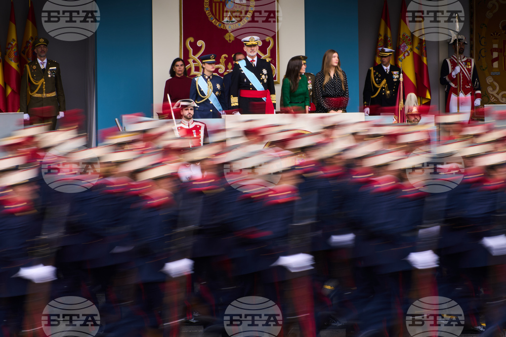 Spain's King Felipe VI, center, Princess Leonor, left, Queen Letizia, second right, and Princess Sofia, right, attend the military parade marking 'Dia de la Hispanidad', or Hispanic Day, in Madrid, Spain, Sunday, Oct. 12, 2025. (AP Photo/Bernat Armangue)