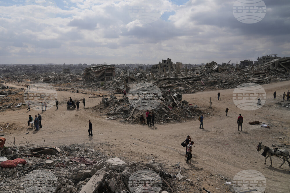 Palestinians walk among destroyed buildings in Gaza City, Sunday, Oct. 12, 2025, after Israel and Hamas agreed to a pause in their war and the release of the remaining hostages. (AP Photo/Jehad Alshrafi)