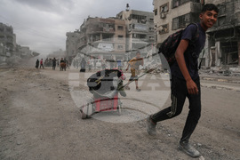 Palestinians push a cart loaded with belongings through a destroyed street in Gaza City, Sunday, Oct. 12, 2025, after Israel and Hamas agreed to a pause in their war and the release of the remaining hostages. (AP Photo/Jehad Alshrafi)