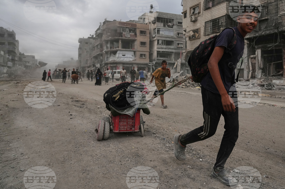 Palestinians carry belongings past destroyed buildings in Gaza City, Sunday, Oct. 12, 2025, after Israel and Hamas agreed to a pause in their war and the release of the remaining hostages. (AP Photo/Jehad Alshrafi)
