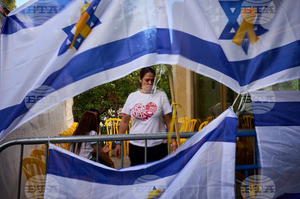 Volunteers prepare Israeli flags as people gather at a plaza known as hostages square, in Tel Aviv, Israel, Sunday, Oct. 12, 2025. (AP Photo/Emilio Morenatti)