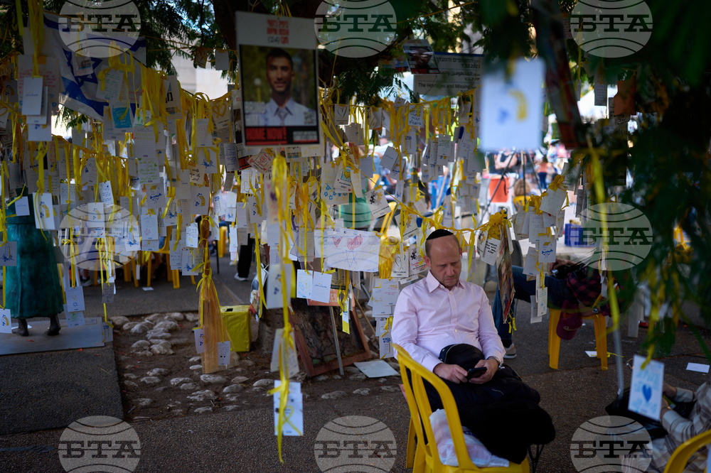 Relatives of Israeli hostages held by Hamas in the Gaza Strip are seen at a plaza known as hostages square, in Tel Aviv, Israel, Sunday, Oct. 12, 2025. (AP Photo/Emilio Morenatti)