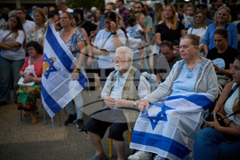Attendees listen to a concert at a plaza known as hostages square, in Tel Aviv, Israel, Sunday, Oct. 12, 2025. (AP Photo/Emilio Morenatti)