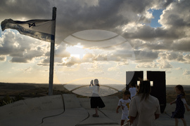 People observe buildings that were destroyed during the Israeli ground and air operations in the northern of Gaza Strip as they visit a sightseeing area in Sderot, Sunday, Oct. 12, 2025. (AP Photo/Leo Correa)