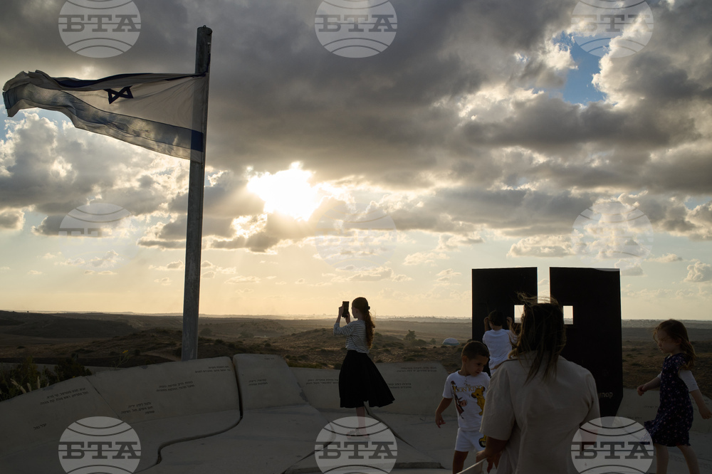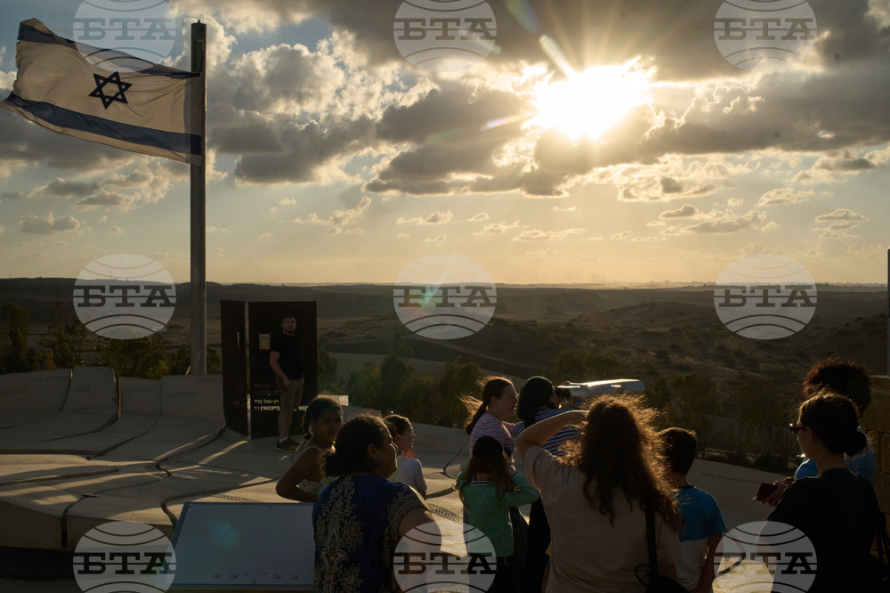 People observe buildings that were destroyed during the Israeli ground and air operations in the northern of Gaza Strip as they visit a sightseeing area in Sderot, southern Israel, Sunday, Oct. 12, 2025. (AP Photo/Leo Correa)