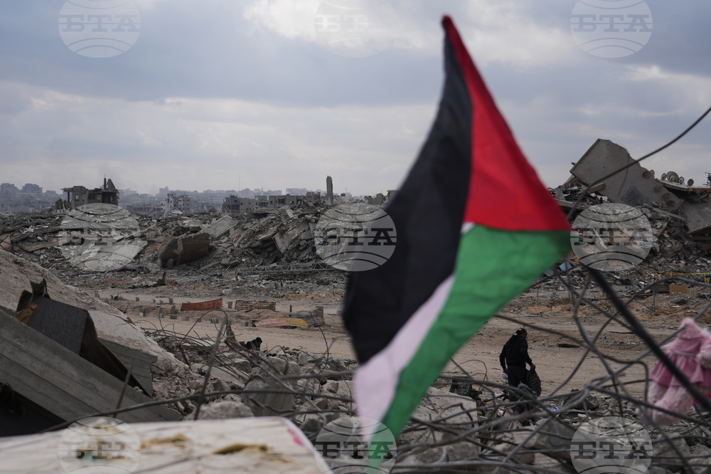 A displaced man walks past a Palestinian flag placed over the rubble of destroyed buildings in Gaza City, Sunday, Oct. 12, 2025, after Israel and Hamas agreed to a temporary pause in their war and the release of the remaining hostages. (AP Photo/Abdel Kareem Hana)