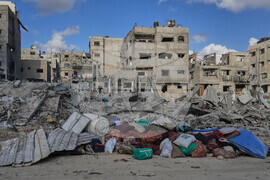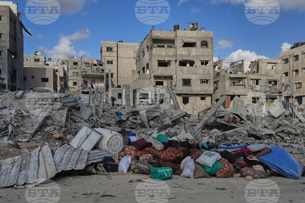 Belongings of displaced Palestinians lie in front of heavily damaged buildings in Gaza City on Sunday, Oct. 12, 2025, following a temporary ceasefire between Israel and Hamas. Residents returned to salvage what they could from the rubble after weeks of intense bombardment. (AP Photo/Abdel Kareem Hana)