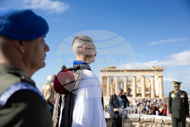 A Greek Presidential Guard performs a flag downhaul during a ceremony marking the 81th anniversary of the liberation of Athens from Nazi German occupation during World War II, at the hill of the Acropolis in Athens, Greece, Sunday, Oct. 12, 2025. (AP Photo/Yorgos Karahalis)