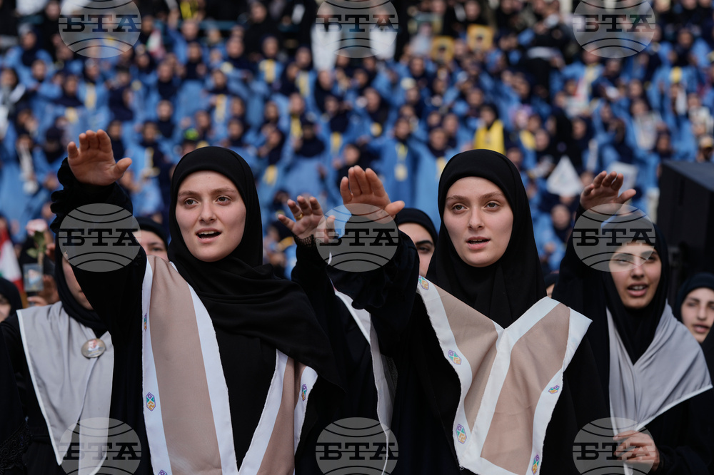 Thousands of Hezbollah's al-Mahdi Scouts repeat the oath of allegiance during a ceremony marking the first anniversary of the assassination of Hezbollah leader Sayyed Hassan Nasrallah, who was killed in Israeli airstrikes, at Sports City Stadium in Beirut, Lebanon, Sunday, Oct. 12, 2025. (AP Photo/Bilal Hussein)