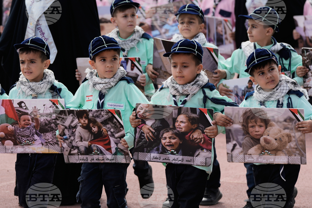 Hezbollah's al-Mahdi Scouts hold posters showing the Israeli bombardment on Gaza, during a ceremony to mark the first anniversary of the assassination of Hezbollah leader Sayyed Hassan Nasrallah, who was killed in Israeli airstrikes, at Sports City Stadium in Beirut, Lebanon, Sunday, Oct. 12, 2025. (AP Photo/Bilal Hussein)