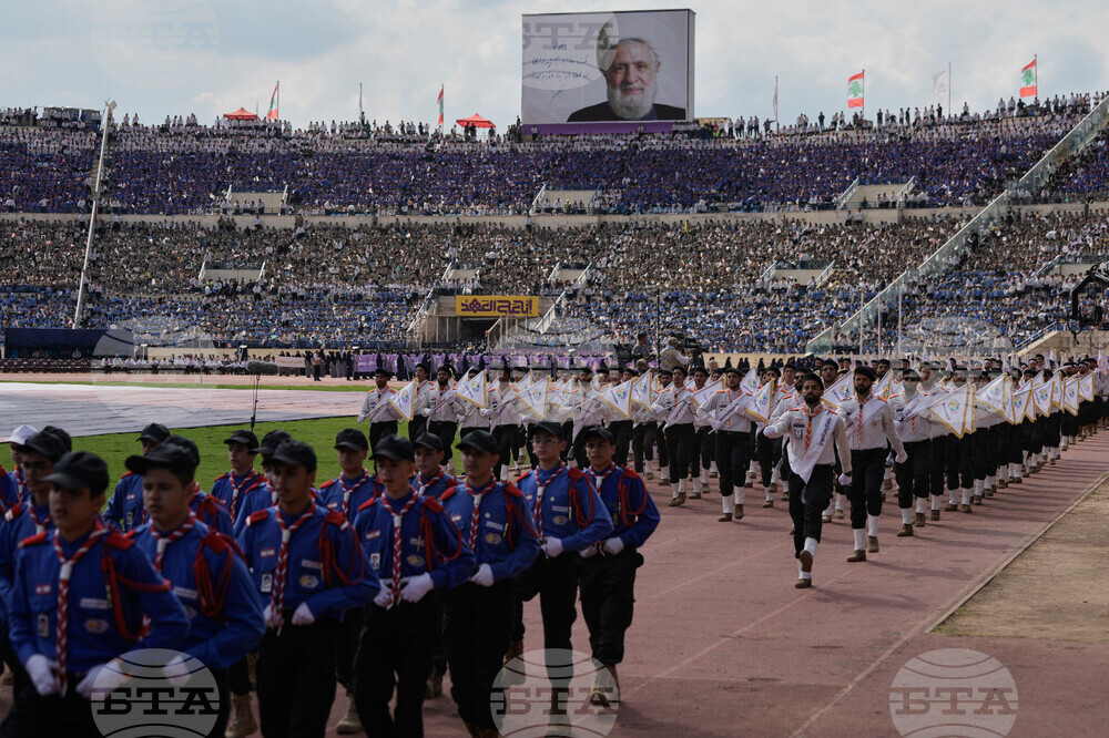 Thousands of Hezbollah's al-Mahdi Scouts display a giant Iranian flag during a ceremony to marking the first anniversary of the assassination of Hezbollah leader Sayyed Hassan Nasrallah, who was killed in Israeli airstrikes, at Sports City Stadium in Beirut, Lebanon, Sunday, Oct. 12, 2025. (AP Photo/Bilal Hussein)