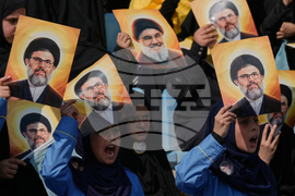 Hezbollah's al-Mahdi Scouts hold pictures of Hezbollah's former leader Hassan Nasrallah and his cousin and successor Hashem Safieddine, to marking the first anniversary of their assassination, who were killed in Israeli airstrikes, at Sports City Stadium in Beirut, Lebanon, Sunday, Oct. 12, 2025. (AP Photo/Bilal Hussein)