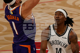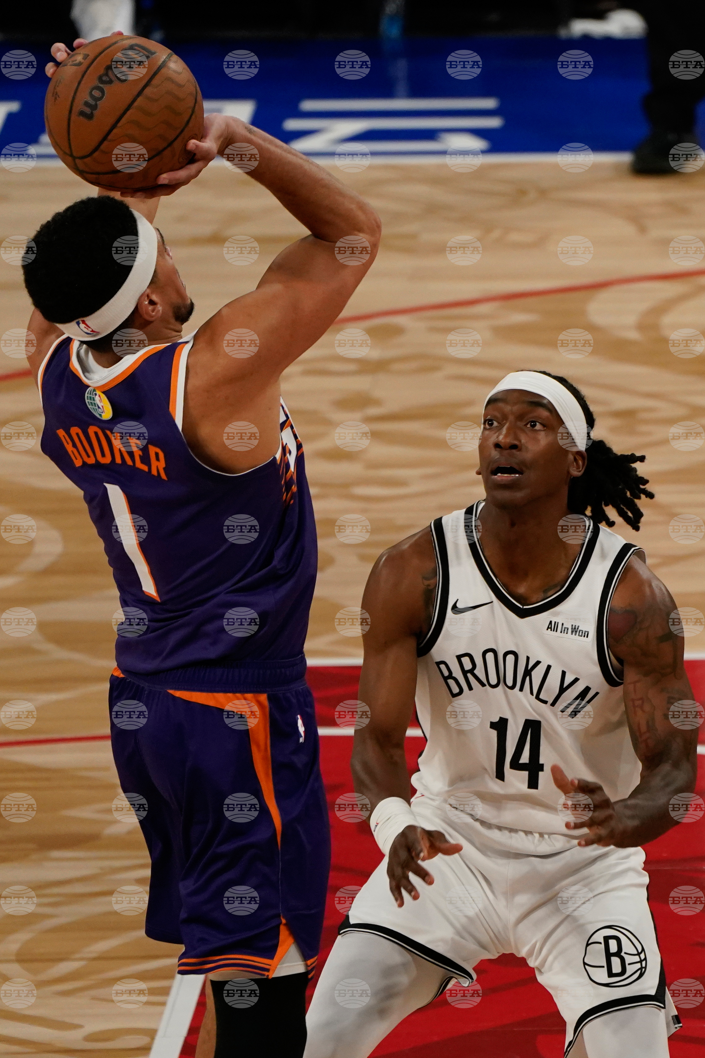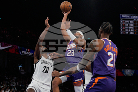 Phoenix Suns guard Devin Booker (1) shoots over Brooklyn Nets guard/forward Terance Mann (14) during a preseason NBA basketball game between Phoenix Suns and Brooklyn Nets in Macao, Sunday, Oct. 12, 2025. (AP Photo/Vernon Yuen)