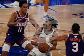 Phoenix Suns forward Oso Ighodaro (11) and Dillon Brooks (3) guard Brooklyn Nets guard Cam Thomas (24) during a preseason NBA basketball game between Phoenix Suns and Brooklyn Nets in Macao, Sunday, Oct. 12, 2025. (AP Photo/Vernon Yuen)