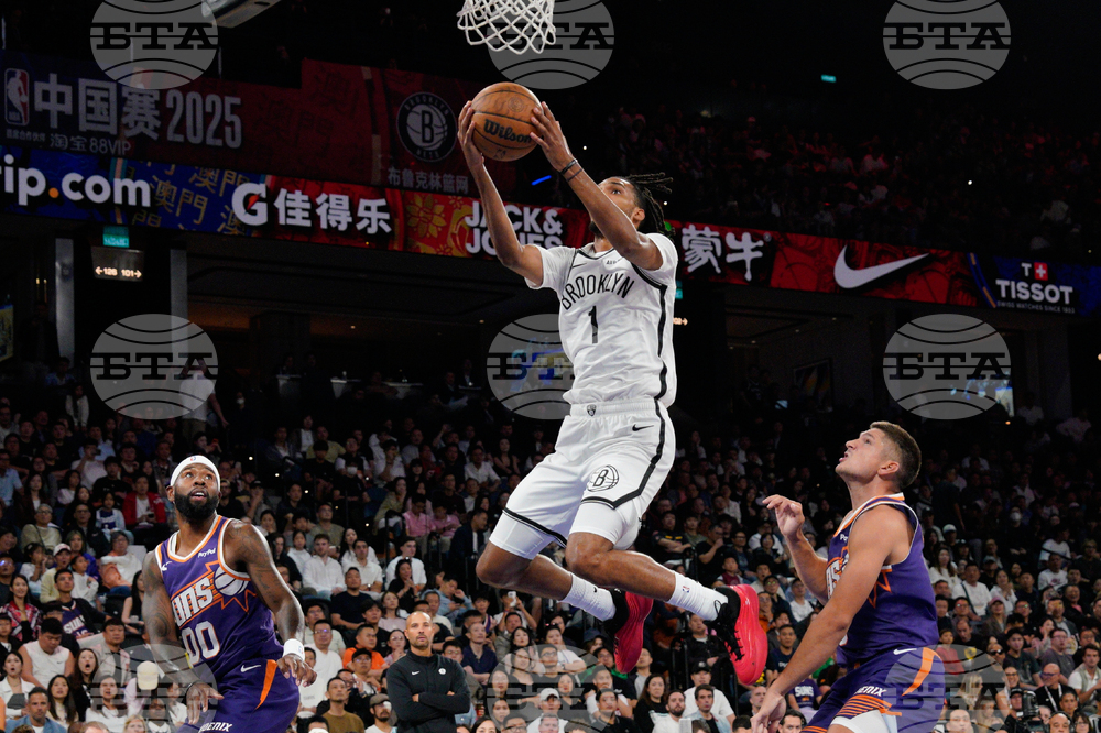 Brooklyn Nets forward Ziaire Williams (1) goes for a layup during a preseason NBA basketball game between Phoenix Suns and Brooklyn Nets in Macao, Sunday, Oct. 12, 2025. (AP Photo/Vernon Yuen)