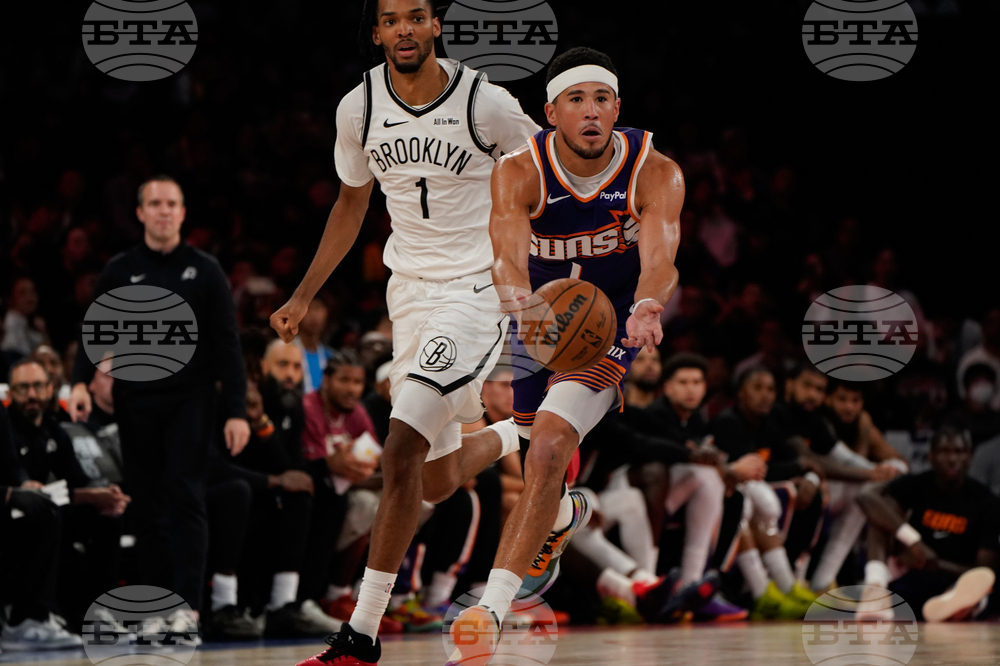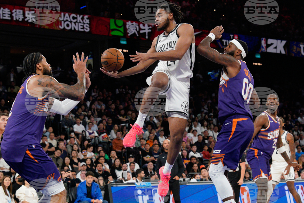 Phoenix Suns guard Devin Booker (1) makes a pass in front of Brooklyn Nets forward Ziaire Williams (1) during a preseason NBA basketball game between Phoenix Suns and Brooklyn Nets in Macao, Sunday, Oct. 12, 2025. (AP Photo/Vernon Yuen)