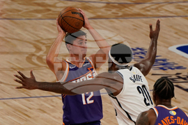 Phoenix Suns Khaman Maluach guards Brooklyn Nets forward Tyrese Martin during a preseason NBA basketball game between Phoenix Suns and Brooklyn Nets in Macao, Sunday, Oct. 12, 2025. (AP Photo/Vernon Yuen)