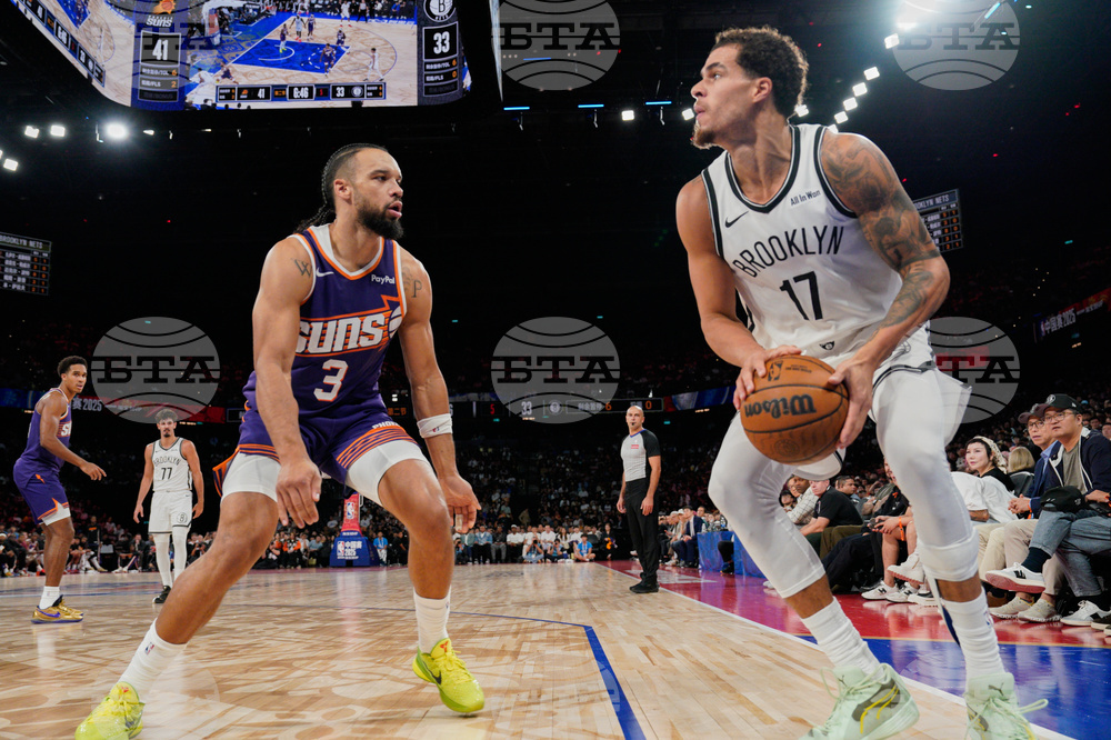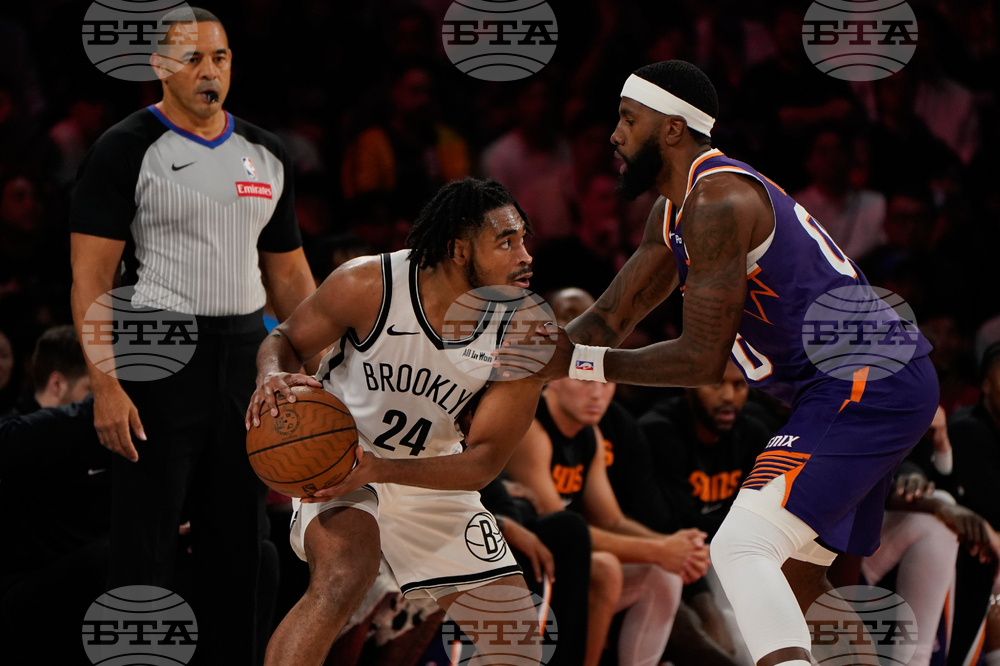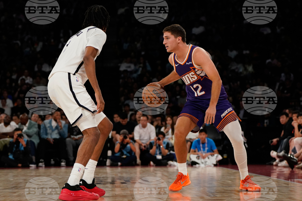 Brooklyn Nets forward Ziaire Williams (1) guards Phoenix Suns guard Collin Gillespie during a preseason NBA basketball game between Phoenix Suns and Brooklyn Nets in Macao, Sunday, Oct. 12, 2025. (AP Photo/Vernon Yuen)