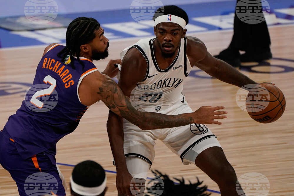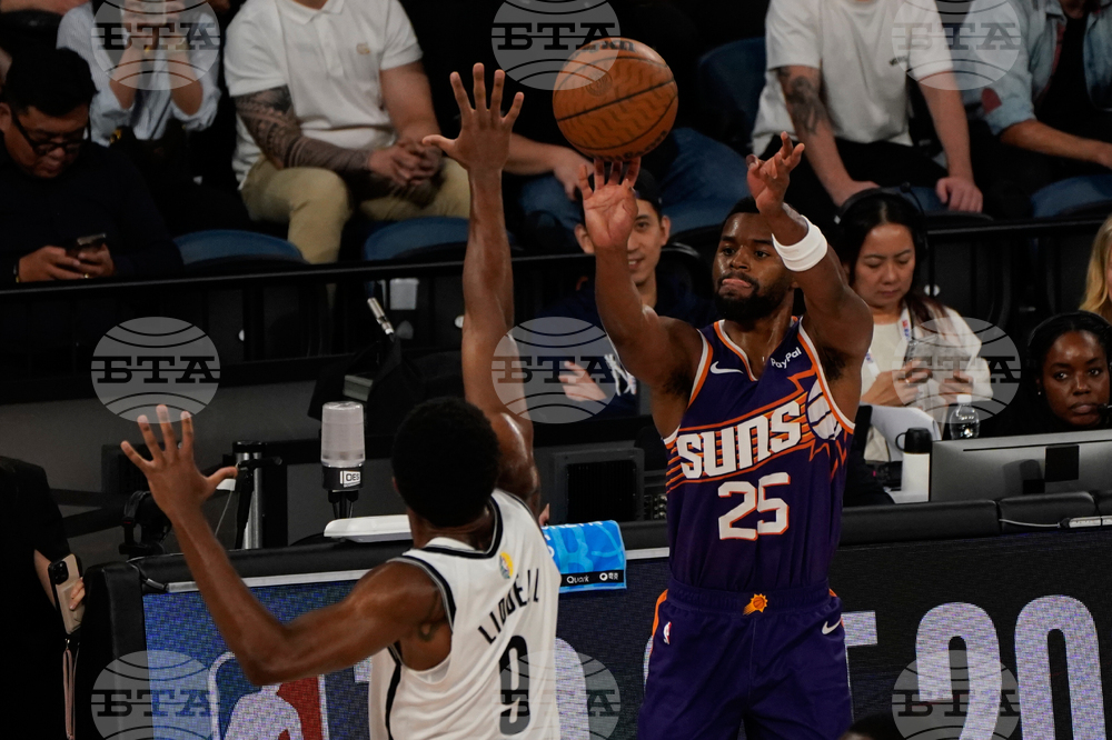 Brooklyn Nets guard/forward Terance Mann (14) blocks Phoenix Suns forward Oso Ighodaro (11) during a preseason NBA basketball game between Phoenix Suns and Brooklyn Nets in Macao, Sunday, Oct. 12, 2025. (AP Photo/Vernon Yuen)