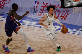 Phoenix Suns guard Collin Gillespie guards Brooklyn Nets forward Ziaire Williams (1) during a preseason NBA basketball game between Phoenix Suns and Brooklyn Nets in Macao, Sunday, Oct. 12, 2025. (AP Photo/Vernon Yuen)