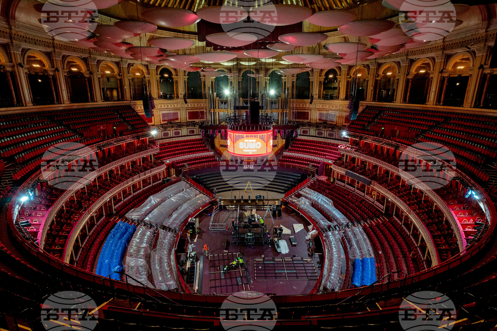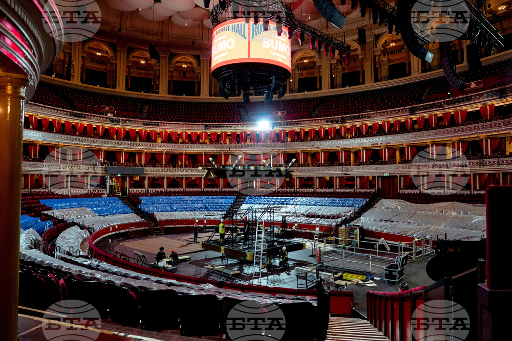 The construction of the dohyo in the auditorium ahead of The Grand Sumo Tournament which starts on Wednesday, at the Royal Albert Hall, London, Sunday, Oct. 12, 2025. (Jordan Pettitt/PA via AP)