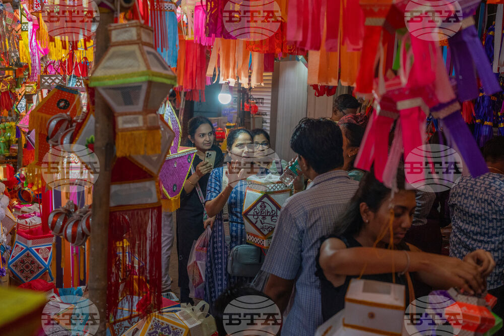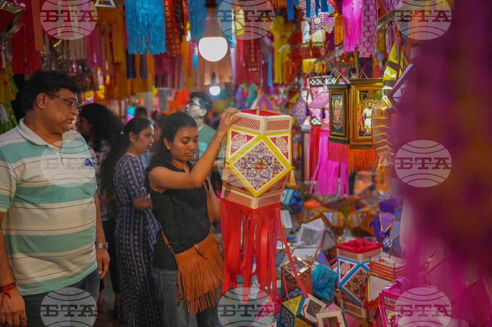 Lanterns are displayed for sale at roadside stalls as people shop ahead of Diwali festival in Mumbai, India. Sunday, Oct. 12, 2025.(AP Photo/Rafiq Maqbool)