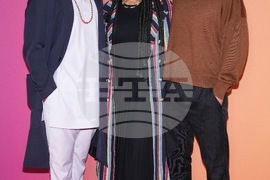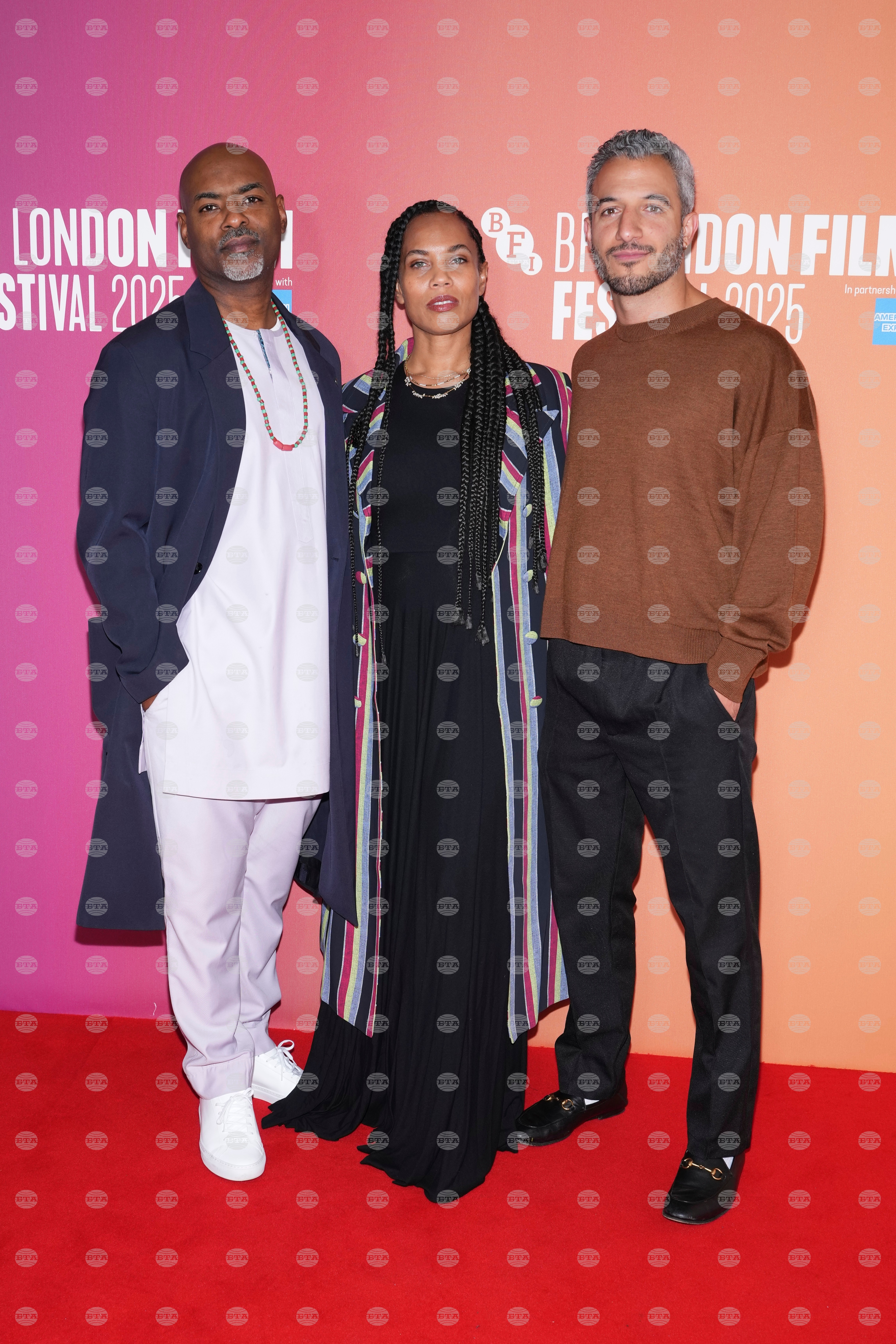 Director Kahlil Joseph, from left, producers Onye Anyanwu, and James Rich pose for photographers upon arrival at the premiere of the film "BLKNWS: Terms & Conditions" during the London film festival in London, Sunday, Oct. 12, 2025. (Photo by Scott A Garfitt/Invision/AP)