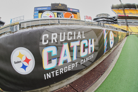 Crucial catch signage is pictured before an NFL football game between the Cleveland Browns and the Pittsburgh Steelers in Pittsburgh, Sunday, Oct. 12, 2025. (AP Photo/Gene J. Puskar)