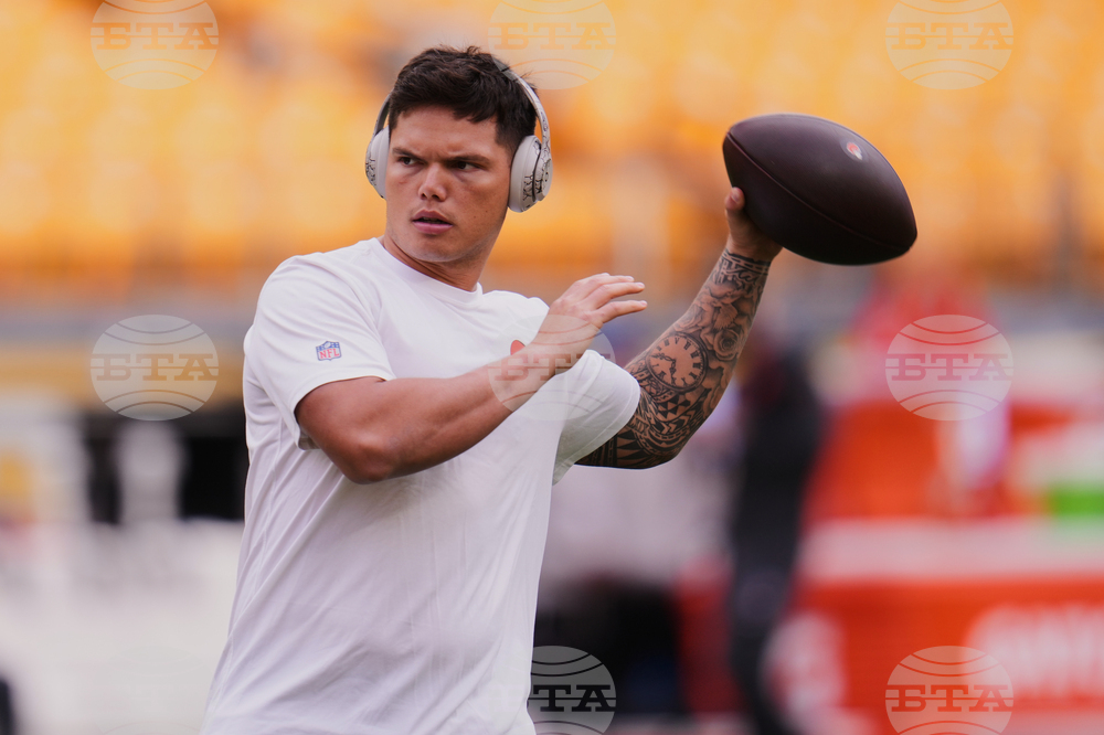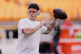 Cleveland Browns quarterback Dillon Gabriel warms up before an NFL football game against the Pittsburgh Steelers in Pittsburgh, Sunday, Oct. 12, 2025. (AP Photo/Gene J. Puskar)