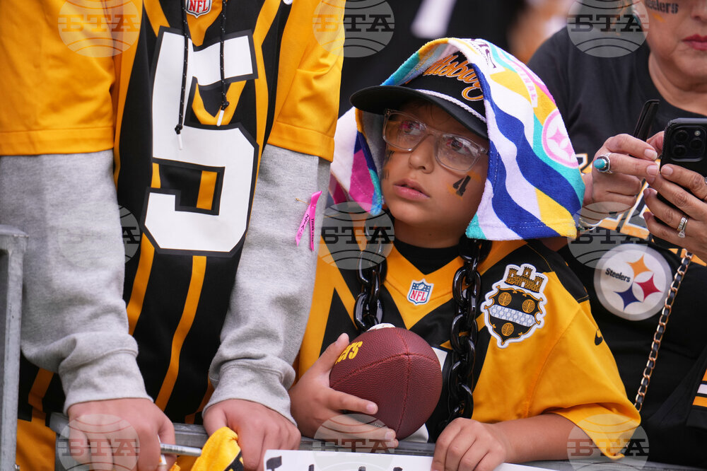 A young fan watches warm ups before an NFL football game between the Cleveland Browns and the Pittsburgh Steelers in Pittsburgh, Sunday, Oct. 12, 2025. (AP Photo/Gene J. Puskar)