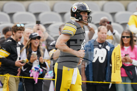 Pittsburgh Steelers quarterback Aaron Rodgers (8) runs past fans before an NFL football game against the Cleveland Browns in Pittsburgh, Sunday, Oct. 12, 2025. (AP Photo/Matt Freed)