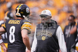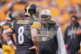 Pittsburgh Steelers quarterback Aaron Rodgers (8) talks with head coach Mike Tomlin, right, before an NFL football game against the Cleveland Browns in Pittsburgh, Sunday, Oct. 12, 2025. (AP Photo/Gene J. Puskar)