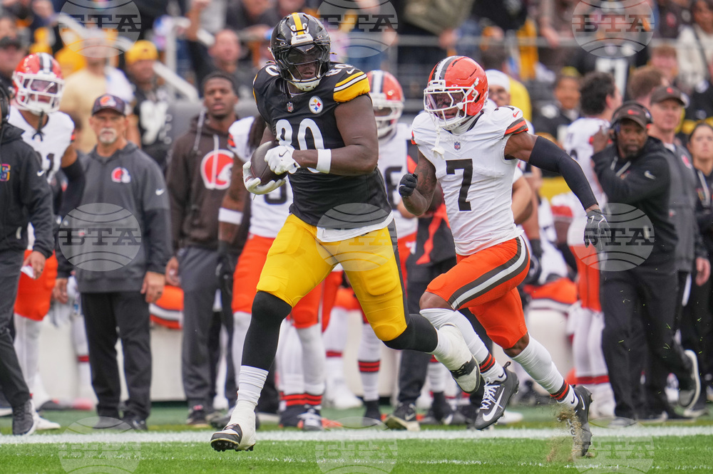 Pittsburgh Steelers tight end Darnell Washington (80) carries as Cleveland Browns cornerback Tyson Campbell pursues in the first half of an NFL football game in Pittsburgh, Sunday, Oct. 12, 2025. (AP Photo/Gene J. Puskar)