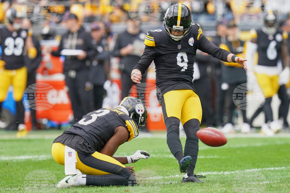 Pittsburgh Steelers' Chris Boswell (9) kicks a field goal as Corliss Waitman (3) holds in the first half of an NFL football game against the Cleveland Browns in Pittsburgh, Sunday, Oct. 12, 2025. (AP Photo/Matt Freed)