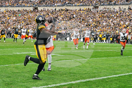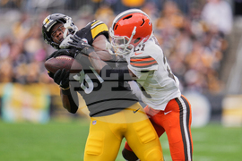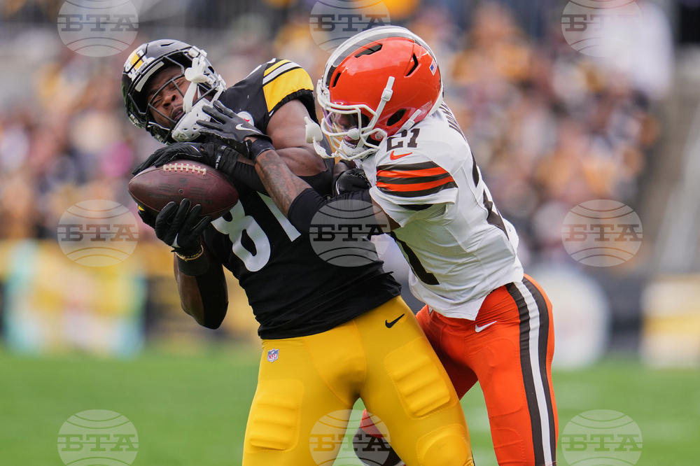 Pittsburgh Steelers tight end Jonnu Smith, left, catches a pass as Cleveland Browns cornerback Denzel Ward (21) defends in the first half of an NFL football game in Pittsburgh, Sunday, Oct. 12, 2025. (AP Photo/Gene J. Puskar)