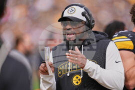 Pittsburgh Steelers head coach Mike Tomlin shouts in the first half of an NFL football game against the Cleveland Browns in Pittsburgh, Sunday, Oct. 12, 2025 (AP Photo/Gene J. Puskar)