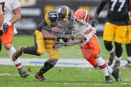 Pittsburgh Steelers running back Kenneth Gainwell (14) is stopped by Cleveland Browns cornerback Myles Harden, right, after a short gain in the first half of an NFL football game in Pittsburgh, Sunday, Oct. 12, 2025. (AP Photo/Gene J. Puskar)