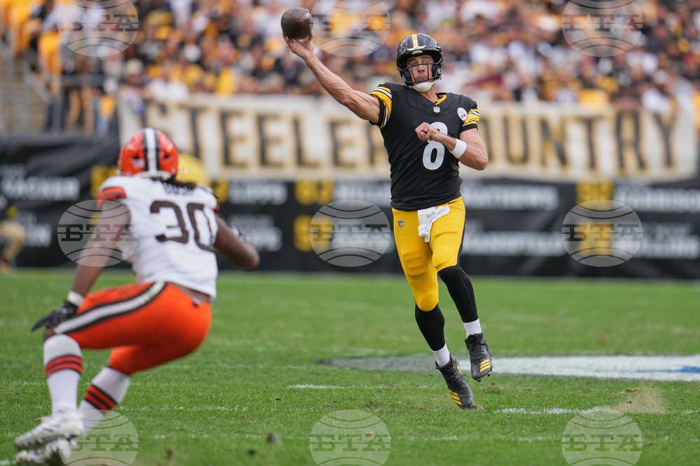 Cleveland Browns quarterback Dillon Gabriel (8) passes under pressure from Pittsburgh Steelers defensive tackle Keeanu Benton (95) in the first half of an NFL football game in Pittsburgh, Sunday, Oct. 12, 2025. (AP Photo/Matt Freed)