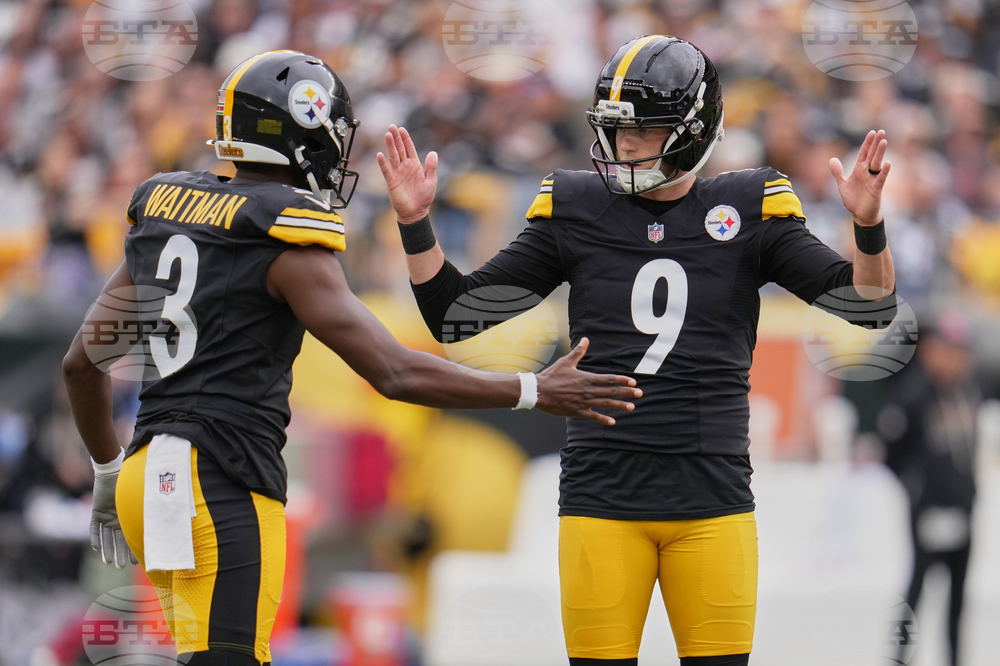 Pittsburgh Steelers kicker Chris Boswell (9) celebrates his 50 yard field goal with punter Corliss Waitman (3) in the first half of an NFL football game against the Cleveland Browns in Pittsburgh, Sunday, Oct. 12, 2025. (AP Photo/Gene J. Puskar)
